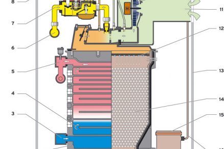 | Popis k schéme: 1 – Odvod kondenzátu, 2 – Výmenník tepla, 3 – Spätný zberač, 4 – Prietok vody vo výmenníku tepla, 5 – Zberač na výstupe, 6 – Snímač tlaku vody, 7 – Prípojka plynu, 8 – Plynová armatúra s horákovým automatom, 9 – Kontrola tlaku vzduchu, 10 – Kontrola tlaku spalín, 11 – Ventilátor, 12 – Pripojenie na prívod vzduchu, 13 – Horák, 14 – Plášť kotla, 15 – Vedenie plynu vo výmenníku tepla, 16 – Pripojenie odvodu spalín, 17 – Zberač kondenzátu |