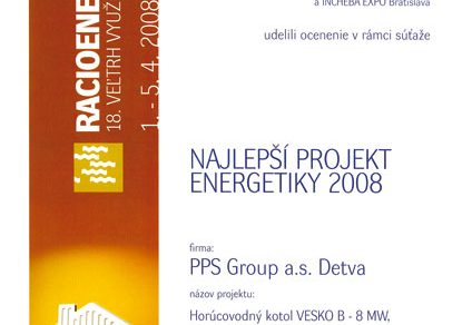 Zámenou palivovej základne zo zemného plynu na dendromasu sa v spoločnosti PPS Group, a. s., so sídlom v Detve naplnili ciele výrazne znížiť náklady na výrobu tepla (a tým aj znížiť nákladovosť výrobného procesu) a dosiahnuť neutrálnu produkciu emisií CO2 do ovzdušia. Tieto skutočnosti viedli zástupcov Ministerstva hospodárstva SR, Slovenskej inovačnej a energetickej agentúry a Incheby Expo k tomu, aby alternatívnu výrobu tepla v horúcovodnom kotli VESKO B – 8 MW s využitím biomasy v spoločnosti PPS Group určili na veľtrhu Racioenergia 2008 za jeden z víťazných projektov súťažnej kategórie Najlepší projekt energetiky 2008.