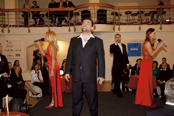 | Finále kultúrneho programu sa nieslo v znamení piesne V dolinách. Zaspievalo ju kvarteto Helga Caspar Koválovská (vľavo), Maroš Pavlovič (v popredí), Karin Olasová a Tomáš Horváth. | Šéfredaktorka časopisu ASB Martina Jakušová v rozhovore s Jurajom Necpalom (vľavo), riaditeľom bytovej výstavby v IPEC Management, a Ladislavom Veršovským, generálnym riaditeľom Reding