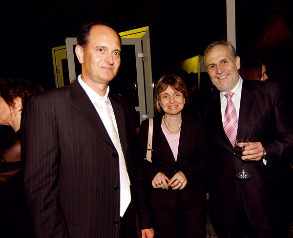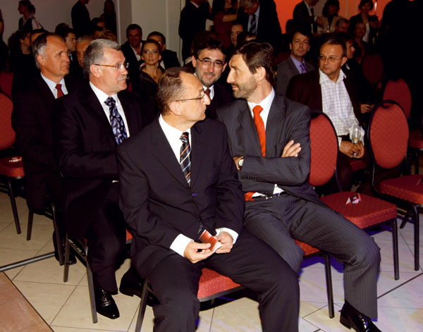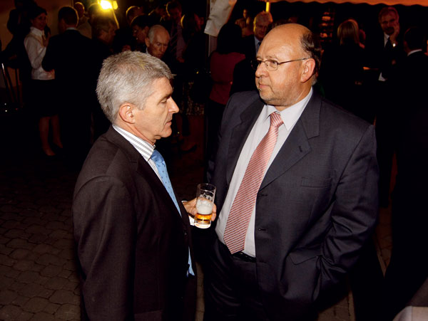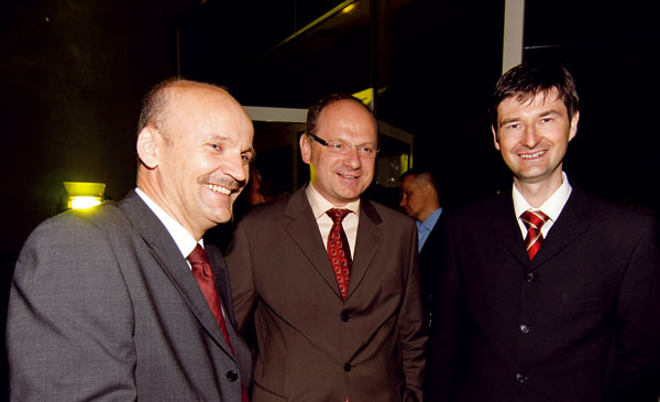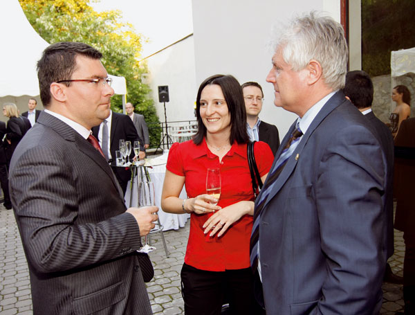 | Generálny riaditeľ Wüstenrot stavebná sporiteľňa Karl Peter Giller (vpravo) v spoločnosti kolegov Lenky Vargovej z marketingu a Pavla Pitoňáka, člena predstavenstva Wüstenrot stavebná sporiteľňa. | K osobnostiam v hľadisku patrili aj – zľava: Dušan Mráz, generálny riaditeľ DOPRASTAVU, a. s. , prezident Zväzu slovenských stavebných podnikateľov Ján Majerský a predseda Žilinského samosprávneho kraja Juraj Blanár. |