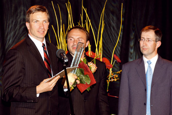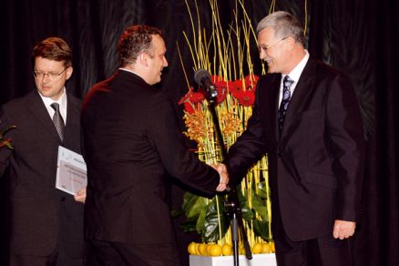 Oto Hornáček vo svojej ďakovnej reči položil auditóriu aj aktuálnu otázku: Kto postaví nový Zimný štadión v Bratislave? Cenu spoločnosti Hornex v kategórii ASB – Stavebná firma roka odovzdal Robert Hilkovič (v pozadí) z firmy ArcelorMittal Construction Slovakia, s. r. o. |