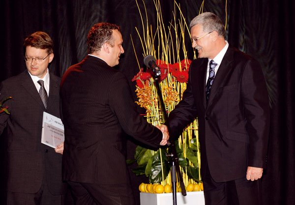 | Člen predstavenstva HB Reavis Group Pavel Trenka s cenou v kategórii ASB – Developer roka. Vedľa neho Rudolf Slezák, generálny riaditeľ spoločnosti Icopal, a. s. a Peter Kremský, šéfredaktor TRENDreality.sk. | Cenu v kategórii ASB – Osobnosť architektúry a stavebníctva odovzdali Dušanovi Mrázovi Vladimír Boroš, obchodný riaditeľ zo spoločnosti Knauf Insulation a Ľudovít Petránsky, zástupca šéfredaktorky ASB. |