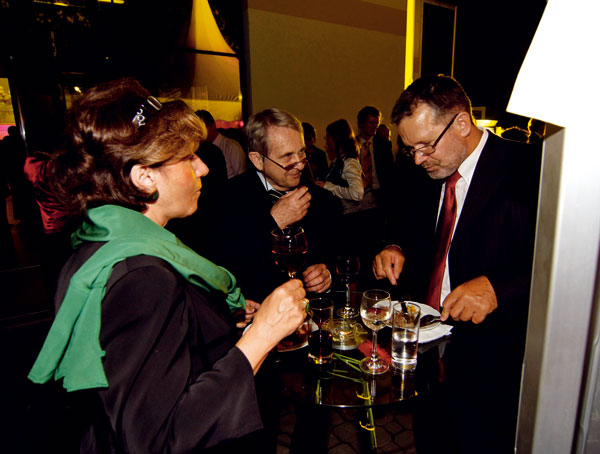 | Manželia Zuzana a Juraj Sternovci za jedným stolom s Gáborom Zászlósom (vpravo), predsedom predstavenstva spoločnosti TriGránit Centrum. | Zľava – Ľudovít Kiripolszky, prokurista firmy Semmelrock Stein & Design, Katarína Šebejová z týždenníka Trend a František Kmiť, konateľ firmy Premac. |
