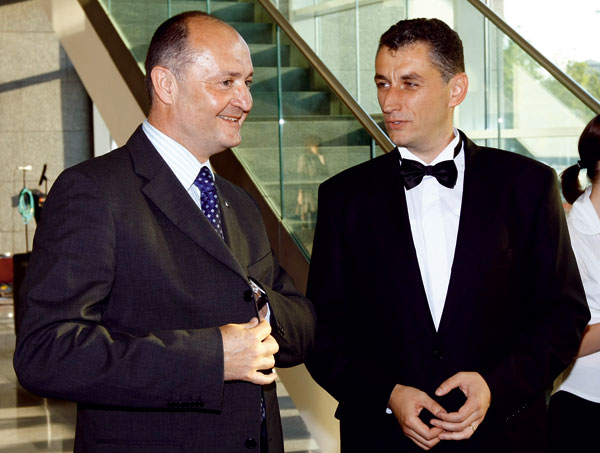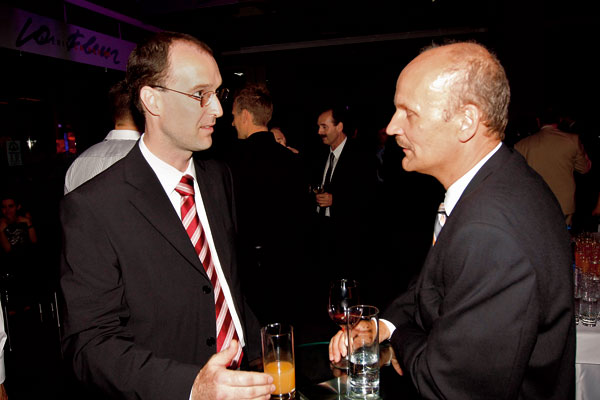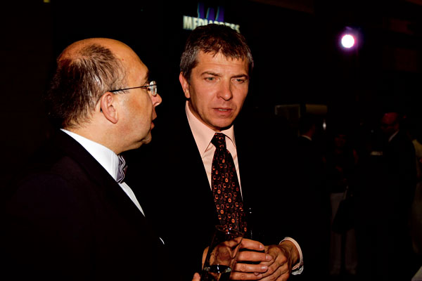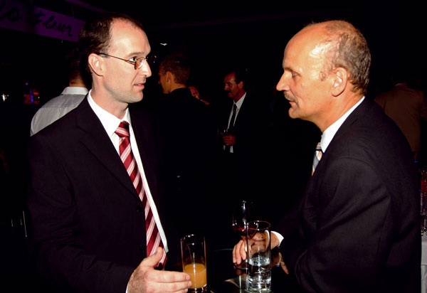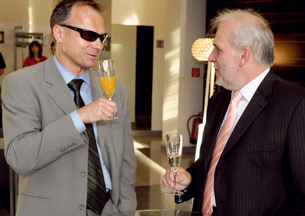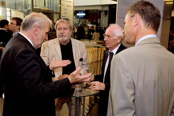 | Zľava – Alojz Kopáčik, dekan Stavebnej fakulty STU v Bratislave (v pozadí), Slavomír Podmanický, generálny riaditeľ REMING CONSULT (vpredu), a Dušan Majdúch, predseda Slovenskej komory stavebných inžinierov | Anton Rehuš (vľavo), obchodný riaditeľ spoločnosti Montáže Čakovice Bratislava, s Pavlom Ďurčokom, marketingovým riaditeľom Schneider Electric Slovakia |