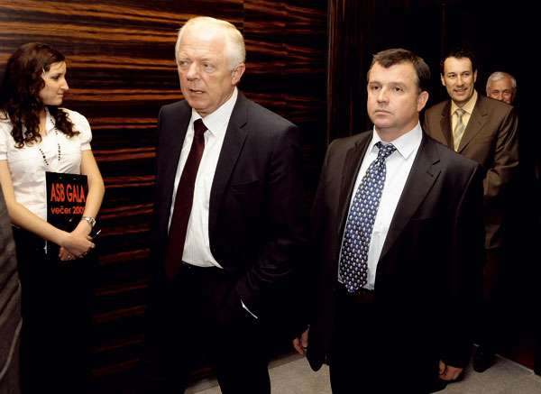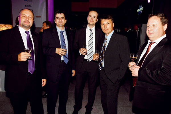 | Zľava – Jaroslav Kamody, riaditeľ spoločnosti Dektrade SR, Roman Regec, generálny riaditeľ Saint-Gobain Construction Products, divízia Rigips, Alexander Prizemin, marketingový manažér Saint-Gobain Construction Products, divízia Isover, Karol Jakabovič, konateľ Saint-Gobain Construction Products, divízia Isover, a Miroslav Síbert, konateľ TDI – Kompleting | Zľava – Pavol Kollár, predseda predstavenstva INVEST IN, a František Kmiť, konateľ spoločnosti Premac |