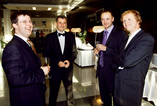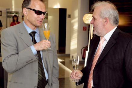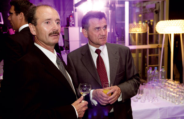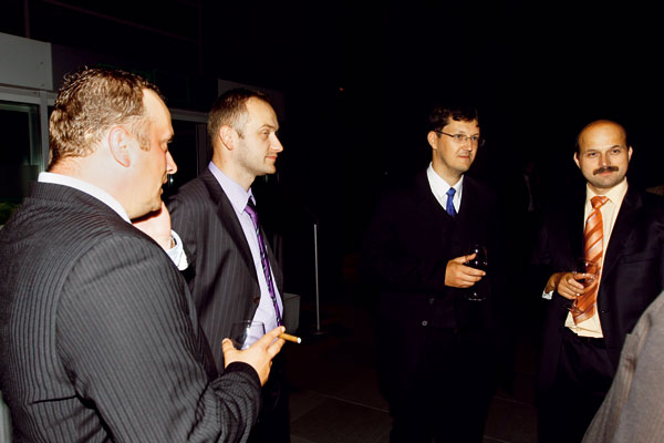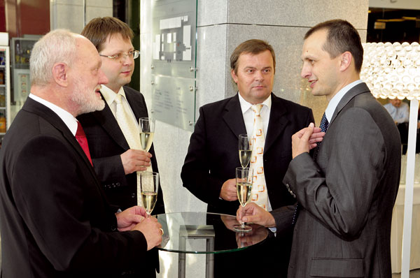 | Dušan Petráš, prorektor STU v Bratislave, (v strede) s manželkou a Otom Hornáčkom, generálnym riaditeľom spoločnosti Hornex | Zľava – Slavomír Seman, obchodný manažér ABB, Štefan Pindroch, obchodný manažér ABB, a Ľubomír Domiňák, konateľ spoločnosti PRIMALEX Slovakia |