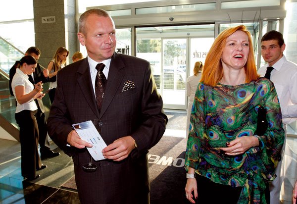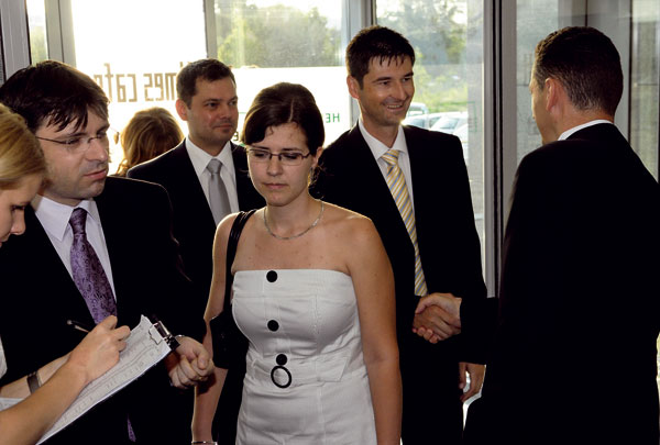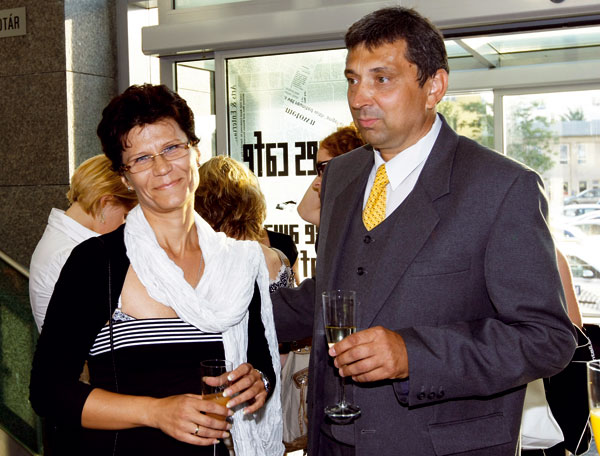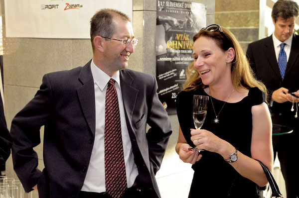 | Juraj Škorvánek, obchodný riaditeľ spoločnosti Ingsteel, so slečnou Bezákovou zo spoločnosti Ingsteel, za nimi Albert Priehoda, marketingový manažér v spoločnosti Xella, a Peter Markovič, obchodný riaditeľ spoločnosti Xella | Erich Feix, člen predstavenstva Prvej stavebnej sporiteľne, s manželkou |