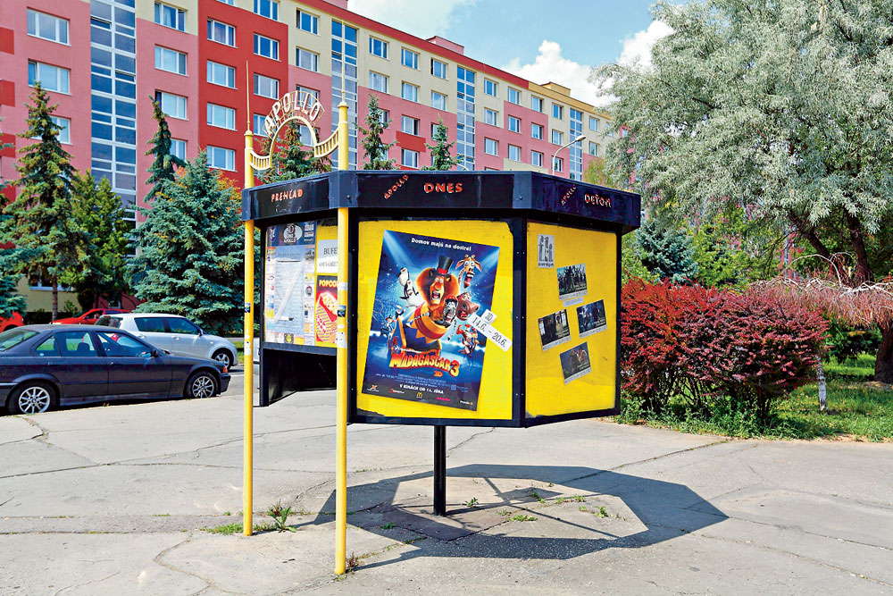 Tento pútač je zaujímavý práve tým, aký je nezaujímavý. A aký neobyčajný by mohol byť, keby mu ostala len stredná noha, ktorá by pri dôkladnom statickom výpočte, primeranej hrúbke a správnom osadení do chodníka uniesla celú tiaž kovovej konštrukcie aj všetkých informácií z plagátov. Takto má stojan dve žlté barličky a dizajnérsky vtip je preč.