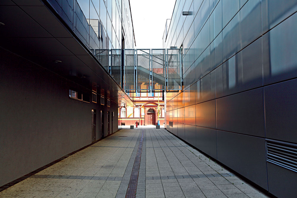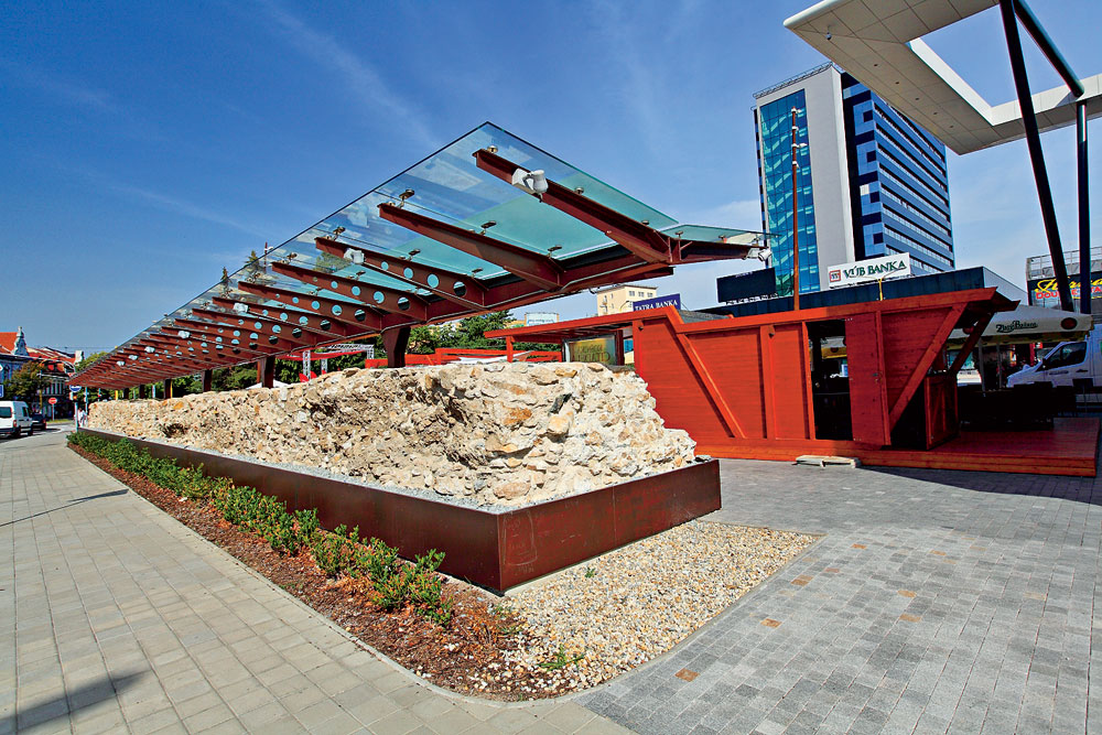 Priestor pred novým nákupným centrom v Košiciach sa počas horúcich letných dní využíva ako vonkajšie sedenie kaviarní a aj ako ihrisko pre plážový volejbal. Kompozícia rôznych tvarov, materiálov a farieb trvalých aj dočasných stavieb, chráneného historického muriva aj pompézneho vstupu pôsobí kontrastne, ale príjemne a vyvážene.