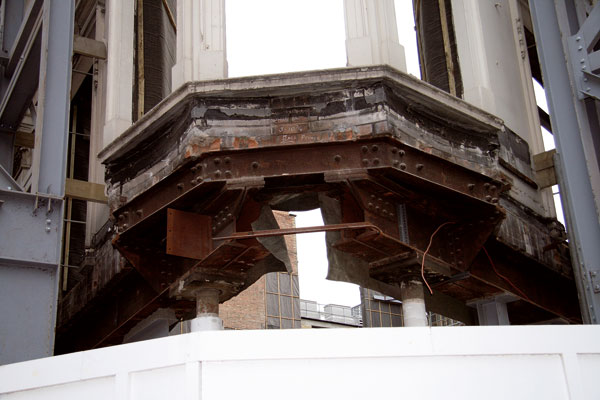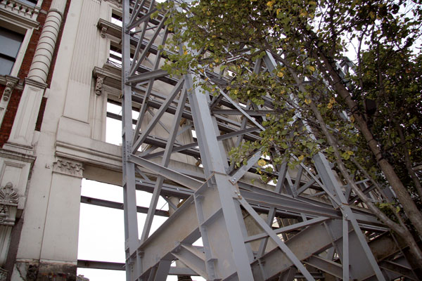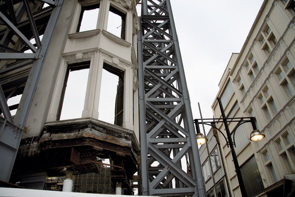 Verím, že aj naše stavebné spoločnosti vedia zachovať pôvodnú fasádu a „prilepiť“ ju na novostavbu, len na to nemajú príležitosť. Skutočne odrezaná fasáda, ktorú drží vo vzduchu oceľová konštrukcia |