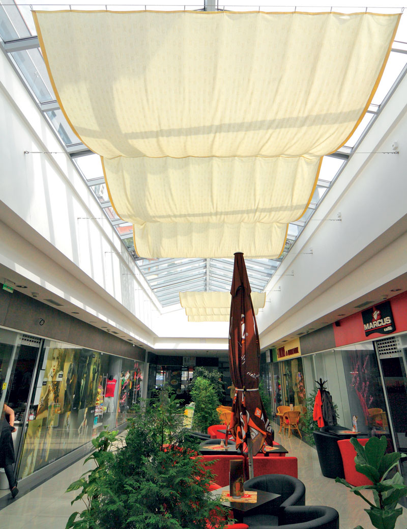 Fotografia vpravo ponúka ilustráciu premysleného dizajnu, ktorého marketingové stratégie sú jasne čitateľné, ale o to atraktívnejšie možnosti pasantom ponúka. Baldachýn pod stropom má nielen tieniacu funkciu, ale priestor navyše zútulňuje. Otáznou ostáva len prítomnosť sklopeného slnečníka. Tí vnímavejší sa aspoň pobavia.