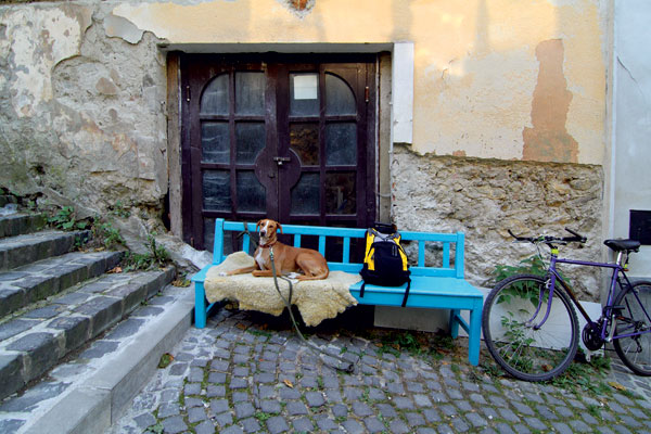 Príklad z bočnej uličky v Trenčíne nepatrí medzi skvosty architektonického dizajnu. Svojskému riešeniu exteriérového posedenia sa však nedá uprieť vtip v podobe nerovnakých nôh lavičky a malebnosť celého výjavu. Až mám podozrenie, že je to len štylizácia pre akvarel.