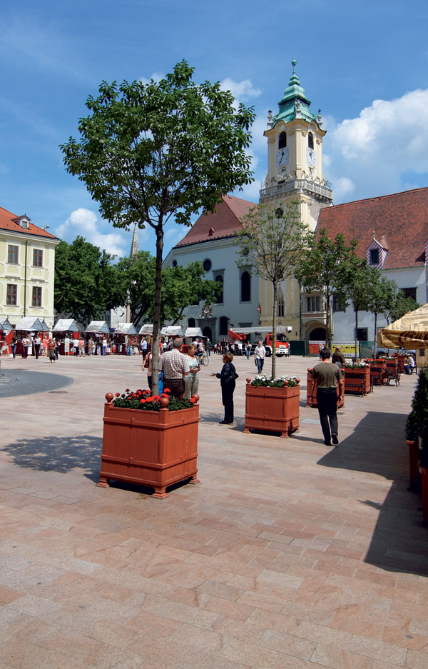 | Námestie nákupného centra Eurovea sa môže popýšiť príjemnou fontánou, ktorá je však aj tak najkrajšia zospodu (má sklenené dno, ktorým do podzemnej časti obchodného domu presvitá denné svetlo). Bratislava však v ňom opäť získala ďalšie kamenné námestie bez zelene, ktoré je takmer zameniteľné s námestím pred Polusom a s priestorom pri Auparku. | Zakrpatená mobilná zeleň neposkytuje Hlavnému námestiu žiaden tieň. Vlastne ani nevytvára dojem zelene. V časoch, keď sa mestá bijú o zelené plochy, pretože ekológia je v móde, si hlavné mesto Slovenska presadilo stromy do kvetináčov. |