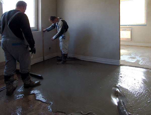| Aplikácia penobetónu a kontrola výšky | Úprava povrchu anhydritového poteru |