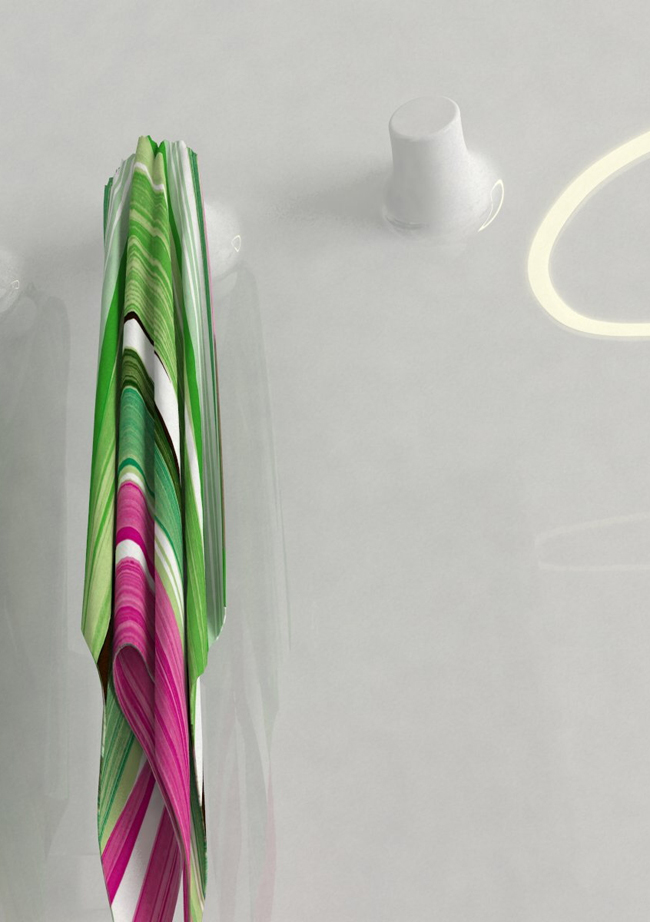 Kúpeľňa, ktorá spĺňa vysoké nároky spoločnosti na neustále sa zvyšujúcu hygienickú čistotu. Návrh rieši čistenie neprístupných miest prikrytím priestoru elastickou textíliou, ktorá povrch uzavrie a zabráni tak vzniku nežiaducich škár a ostrých rohov. Variabilná vaňa a sprchovací kút v jednom umožňujú vytvoriť priestor nielen na očistu, ale aj na určitý druh relaxu. Na podlahe je pod elastickou textíliou ukrytá pneumatická konštrukcia, ktorá pretláča cez textíliu špeciálne pripravené oceľové rámy, ktoré vytvárajú tvar vane, vaničky či umývadla.