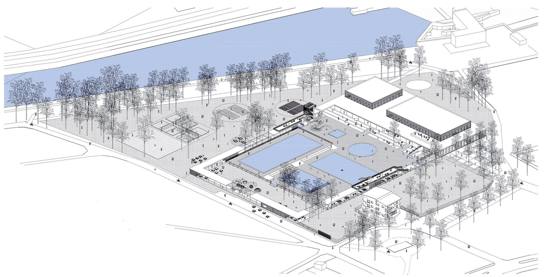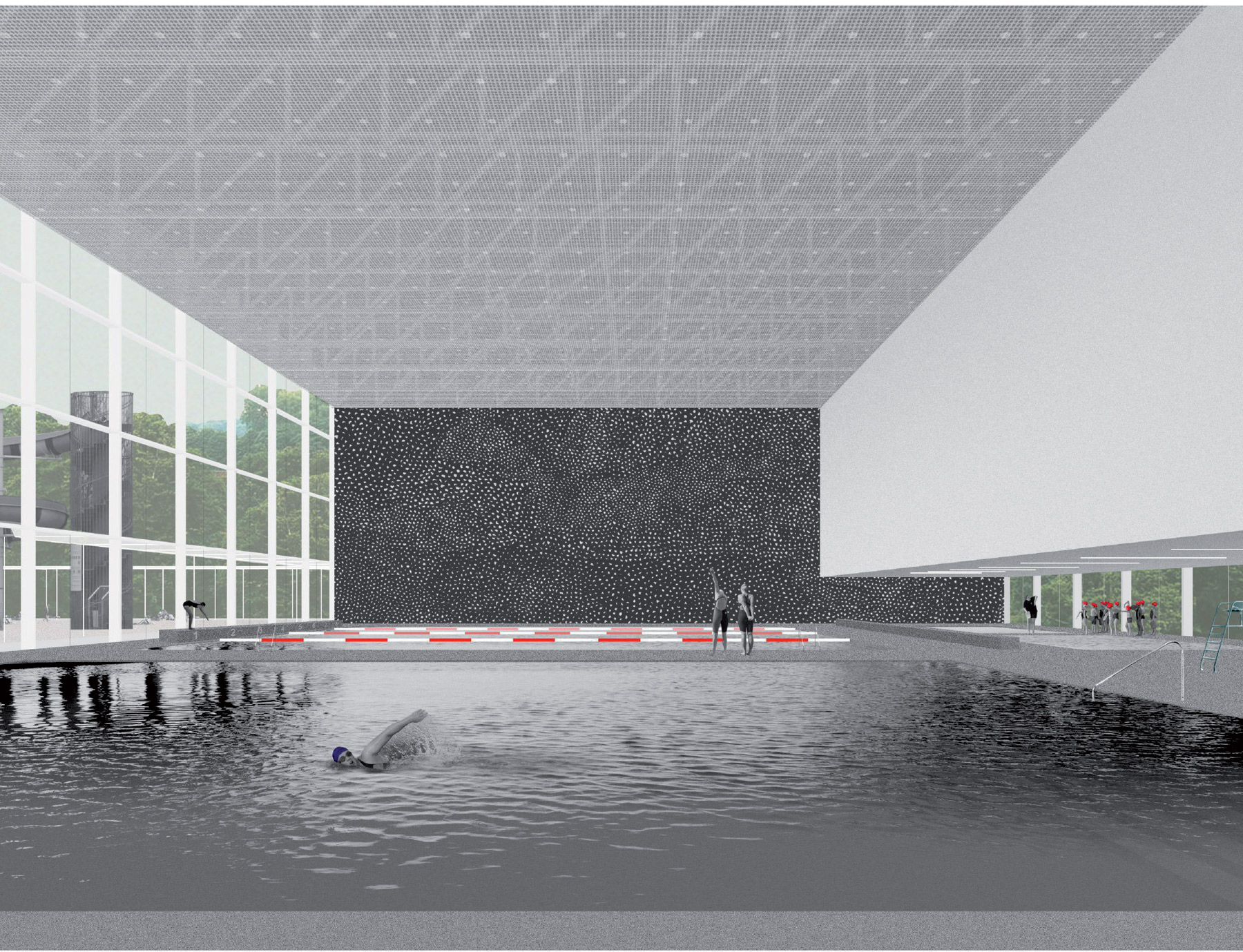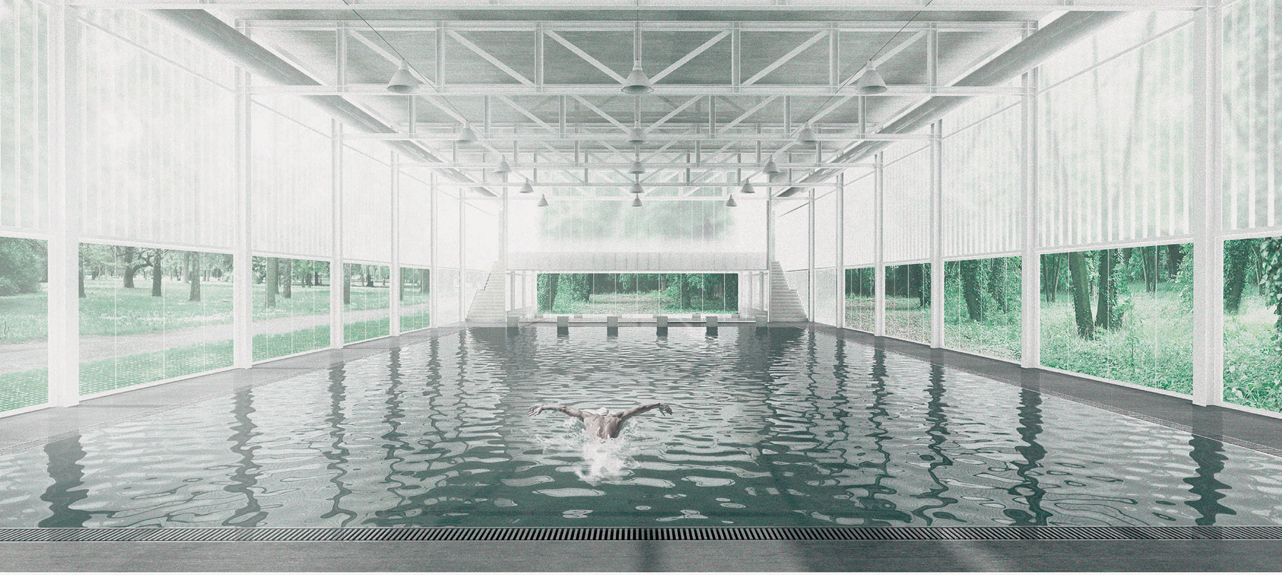 Veľmi decentne vytvárali akcent nad bazénmi, čím v parku podčiarkujú silu nízkej budovy akoby pavilónu. Celkové riešenie nevytvára vizuálnu bariéru v parku, skôr sa stáva jeho súčasťou.“ Spracovanie návrhu jednoduchou grafikou len podporilo kultivovanosť architektonického riešenia. Autormi víťazného návrhu sú Ing. arch. Katarína Bergerová, Ing. arch. Patrícia Botková, Ing. arch. Martin Hudec, Mgr. art. Marián Stanislav, Ing. arch. Andrej Šabo a Ing. arch. Samuel Zeman, účastník: Ing. arch. Peter Janeček.