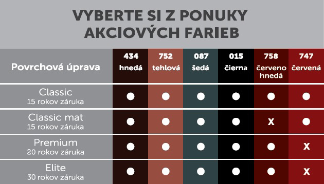 - akciové zľavy platia len na krytiny a farby uvedené v tabuľke