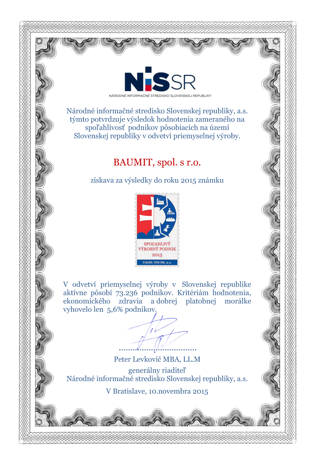 Baumit, spol. s r.o. patrí do skupiny spoločností, ktoré prešli prísnou analýzou s výbornými výsledkami a získal tak známku „Spoľahlivý výrobný podnik 2015“. Známku udeľuje Národné informačné stredisko Slovenskej republiky (NiSSR), ktoré každoročne analyzuje hospodárske prostredie a ekonomické zdravie podnikov.