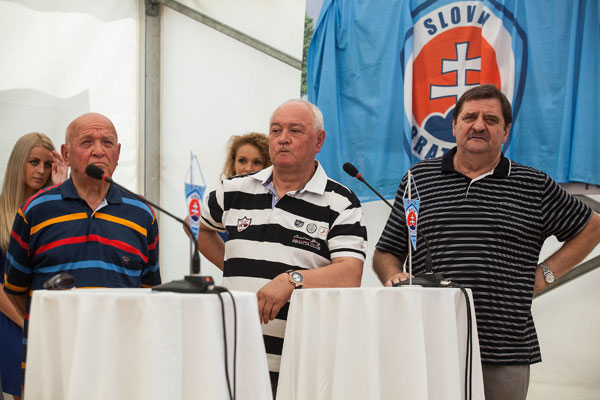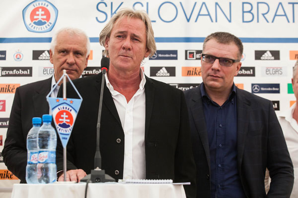 Zľava: Bývalý hráč ŠK Slovan Bratislava Dušan Galis, majiteľ futbalového klubu ŠK Slovan Bratislava Ivan Kmotrík a prezident SFZ Ján Kováčik na TB futbalového klubu ŠK Slovan Bratislava o demolácii a výstavbe nového štadióna na Tehelnom poli.