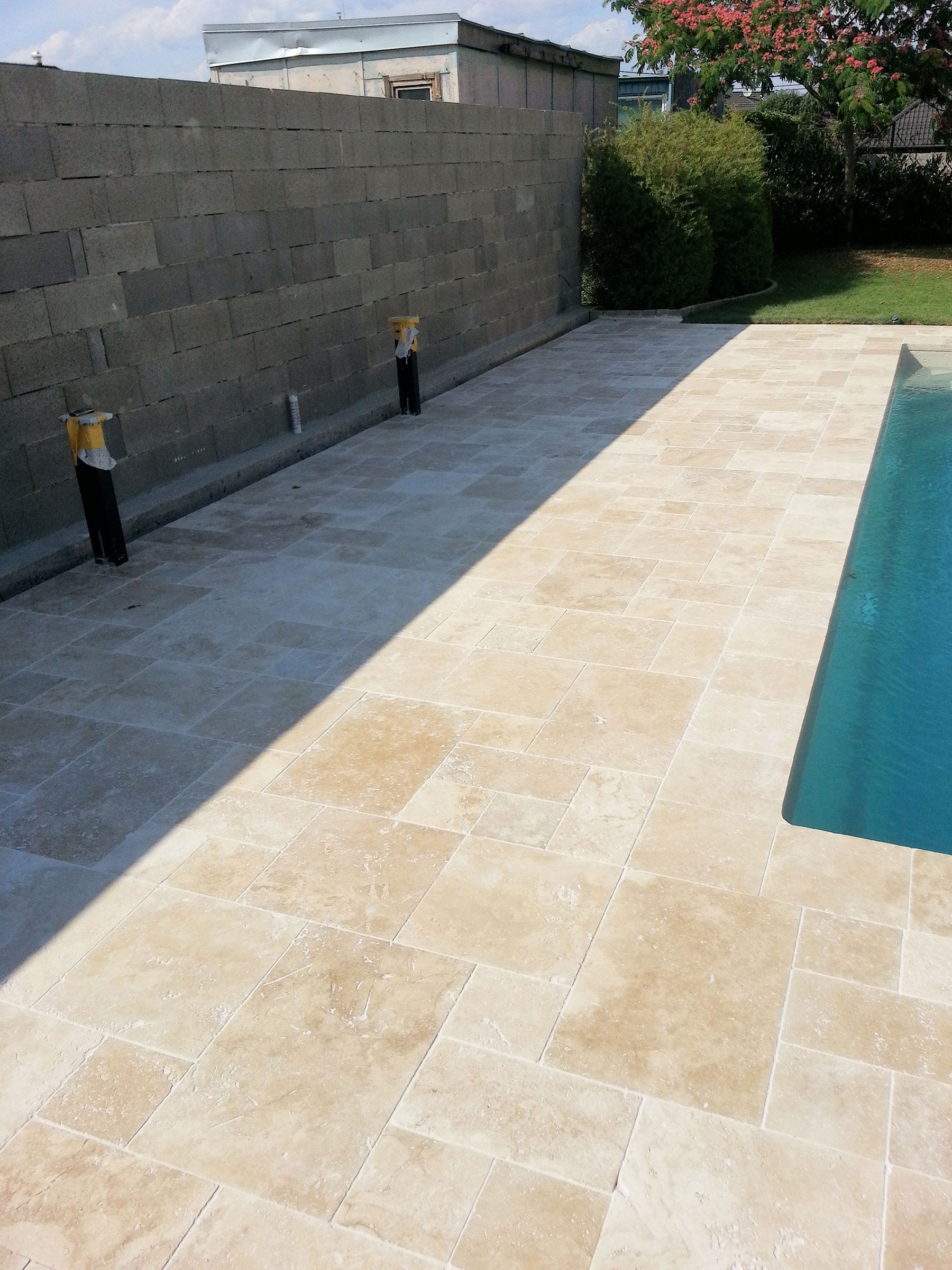 Vďaka miernej pórovitosti sa na travertíne nešmyknete, preto je vhodný i okolo bazénov čo je jeho obrovská výhoda napríklad oproti mramoru či žule. Akumulačná schopnosť a svetlá farebnosť travertínu zabezpečujú, že i na priamom slnku pri 45 stupňoch môžete naň stupiť bosou nohou a nepopálite sa. To je jeden z dôvodov prečo väčšina víl na Floride či Austrálií má na terase travertín.