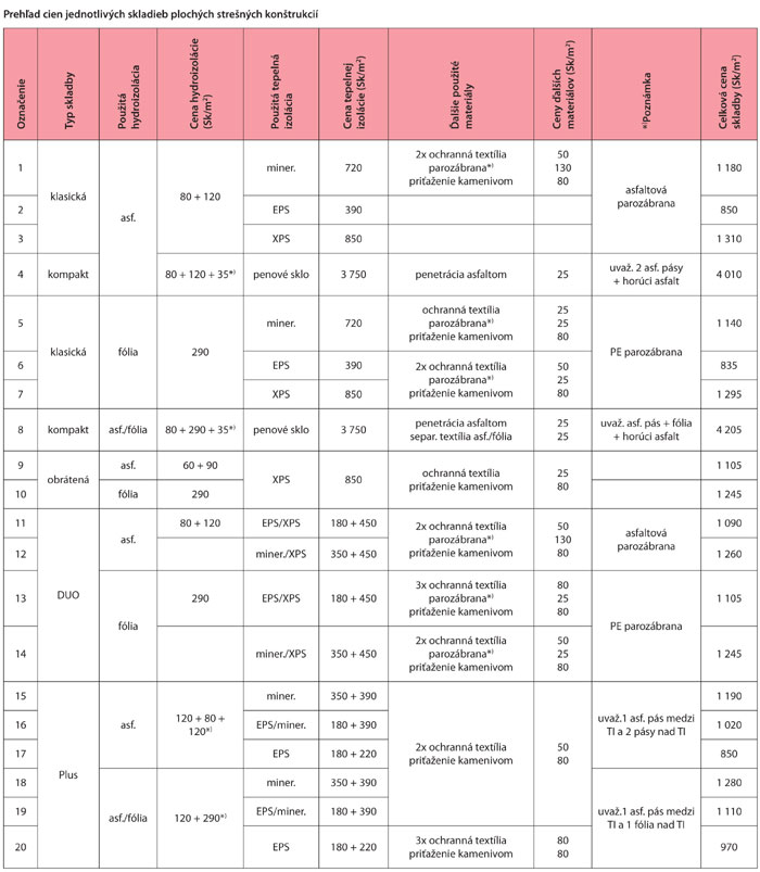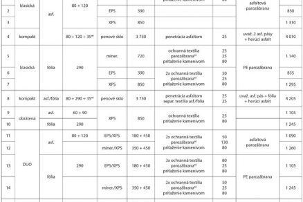 - výsledné ceny obsahujú iba jednotlivé prvky samotnej funkčnej skladby strešnej konštrukcie, neobsahujú cenu nosnej konštrukcie, spádové vrstvy z vyľahčeného betónu a finálne nášľapné, pojazdné či nepochôdzne úpravy.