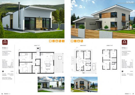 Každý projekt je prehľadne spracovaný na jednej strane. Okrem obrazového materiálu obsahuje aj informácie o počte obytných miestností, výmerách, orientácii na svetové strany i predpokladanej spotrebe energií.