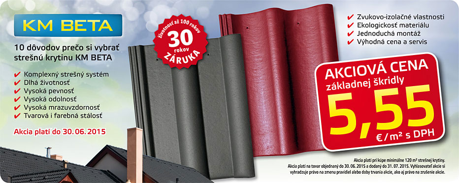 Navyše teraz môžete nakúpiť strešnú krytinu KM BETA za akciovú cenu 5,55 €/m2 s DPH.