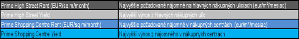 Najvyššie požadované nájomné v nákupných centrách (Prime Shopping Centre Rent): Najvyššia možná cenová hladina prenájmu na otvorenom trhu, ktorá sa predpokladá pri bežnej jednotke štandardnej veľkosti v kvalitnom nákupnom centre. Údaj nezahŕňa dane, prevádzkové náklady a ústupky zo strany majiteľa.