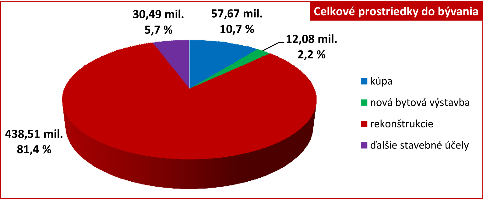 Bývanie je segment, ktorý ovplyvňuje viacero faktorov. Jednak záujem samotných ľudí o zaobstaranie si nového či rekonštrukciu súčasného bývania, ale aj podmienky na trhu a možnosti financovania. Rok 2014 bol z pohľadu prostriedkov, ktoré PSS, a. s., do bývania vložila mimoriadne úspešný. Prostredníctvom nasporených peňazí, ale aj úverov na bývanie to bolo celkom 538,74 mil. eur. Aj v tejto oblasti sme zaznamenali rast, keďže v roku 2013 poskytla PSS, a. s., celkom do bývania 480,73 mil. eur. Ide o 12-percentný rast. Už tradične, najviac prostriedkov smerovalo aj vlani do rekonštrukcií a obnovy.  Viac v grafe.