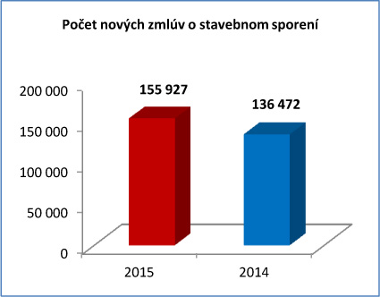 Prvá stavebná sporiteľňa uzatvorila v roku 2015 celkom 155 927 nových zmlúv o stavebnom sporení. V porovnaní s predchádzajúcim rokom ide o 14-percentný nárast. Pozitívny trend sledujeme aj v objeme cieľových súm nových zmlúv. Klienti uzatvorili v roku 2015 zmluvy s objemom 2,83 mld. eur, čo je o 22 % viac ako v roku 2014. Dvojpercentný nárast v objeme cieľových súm sme zaznamenali aj v detskom stavebnom sporení JUNIOR EXTRA. Priemerná cieľová suma novej zmluvy vzrástla v roku 2015 na 18 143 eur zo 17 087 v predchádzajúcom roku.