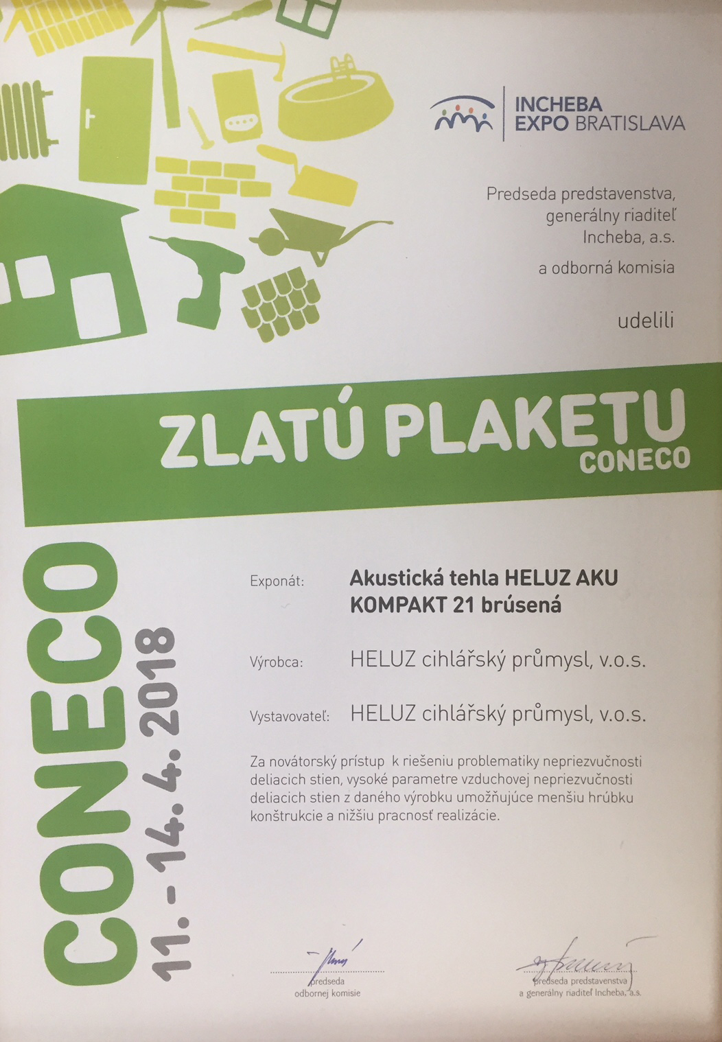 V priebehu veľtrhu spoločnosti HELUZ odovzdali Zlatú plaketu Coneco. Táto cena sa udeľuje exponátom, ktoré vynikajú v niektorých z týchto kritérií: kvalita, spracovanie, dizajn, fyzikálne vlastnosti atď; hodnotí ich odborná porota. HELUZ získal Zlatú plaketu Coneco za inovatívny prístup k riešeniu problematiky v oblasti akustiky s výrobkom HELUZ AKU KOMPAKT 21 brúsená. Cenu si prevzal obchodný a marketingový riaditeľ Ing. Petr Stejskal.