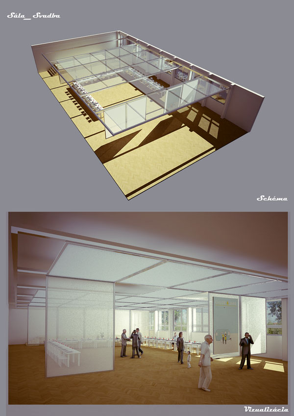 „Variabilný stropný systém umožňuje premeniť aj neútulné veľké spoločenské miestnosti na moderne pôsobiace a štruktúrované priestory,“ hovorí Ing. arch. Ladislav Slabey. „Jeho umiestnenie síce vyžaduje stavebné úpravy a dômyselnú prácu so svetlom, prakticky každá rekonštrukcia či inštalácia v novom priestore vyžaduje vlastné sofistikované riešenie, avšak výsledok je, že prevádzkovateľ má možnosť z jednej veľkej miestnosti spraviť užitočné, variabilné, ale aj efektne pôsobiace centrum, v ktorom nie je problém rozparcelovať priestor. Manipulácia je pritom jednoduchá a veľmi rýchla, premeniť miestnosť z veľkej sály napríklad na niekoľko menších miestností pre galerijne účely či stolnotenisový turnaj trvá rádovo niekoľko minút.“