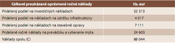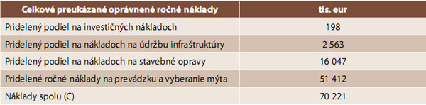 Celkové preukázané oprávnené ročné náklady pridelené ťažkým vozidlám v cestnej sieti diaľnic a rýchlostných ciest sú 88 044 000 eur (tab. 3) a cestám I. triedy sú 70 221 000 eur (tab. 4).