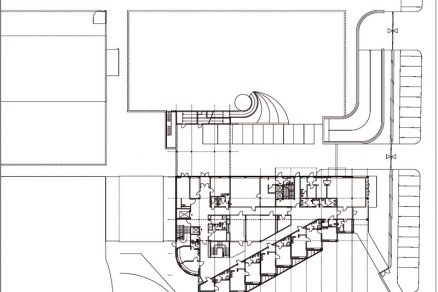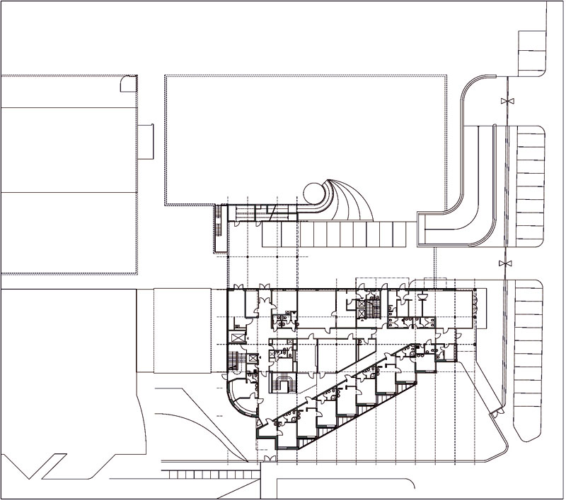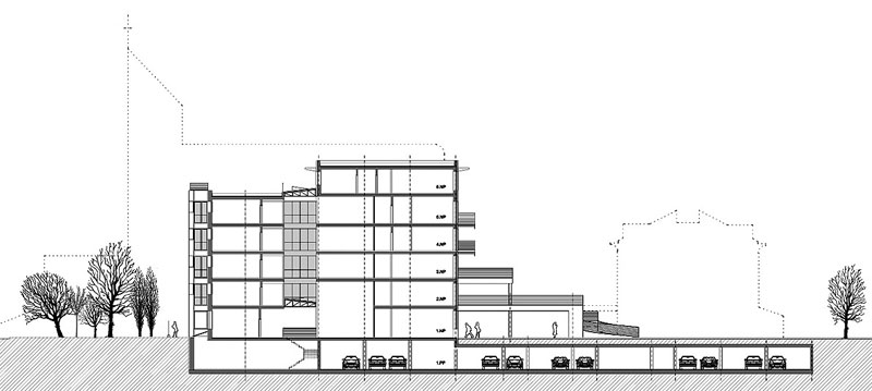Autori tak otvorili celý uličný front areálu, ktorý akoby vytváral ochrannú bariéru pred negatívnym vplyvom rušnej ulice. Tento moment sleduje aj základné formovanie dispozície, ktoré je viac uzavreté a orientované dovnútra okolo veľkého vnútorného svetlíka. Otvorené je len vo východnej a južnej orientácii do pokojovej zóny.