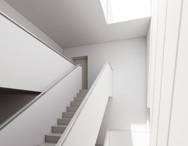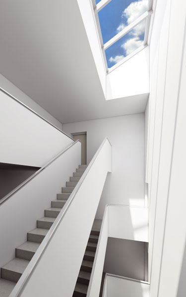 Vnútorné priestory domu sa riešia tak, aby sa dosiahlo maximálne preslnenie a presvetlenie denným svetlom. Schodisková hala je otvorená na celú výšku domu a zhora ukončená veľkým strešným svetlíkom. Denná časť bytov je riešená ako multifunkčný obytný priestor rodiny so zachovaním možnosti stavebného vyčlenenia kuchyne.