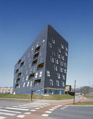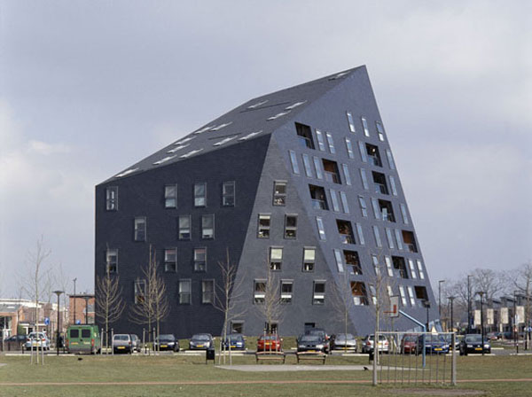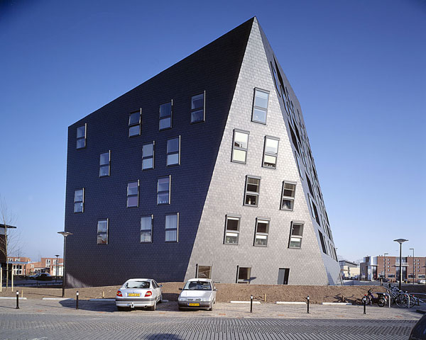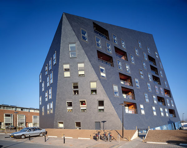 Budova vzhľadom pripomína asymetrickú kocku s bridlicovým plášťom, ktorej masívna forma poskytuje spolu na ploche 5000 m2 priestor pre 22 bytov a detské centrum. Mierka návrhu i samotné zhmotnenie idey predstavuje nápadne pôvabný, zvláštny až neobyčajný útvar. Balvanovitý blok Het Baken (z hol. „maják“) sa týči ako pomyslený útes nad rovinatou, výrazovo mdlou krajinou, súčasne tvorí významný „vítajúci“ orientačný bod v krajine, a to údajne zo všetkých pohľadov.Prízemie slúži ako istý priehľadný podstavec objemu stavby vystupujúcemu nad ním na dve strany. Je tu škôlka, ktorej presklená fasáda bohato komunikuje s prostredím. Byty na nasledujúcich siedmych podlažiach nad ním sa pýšia širokou škálou pôdorysov vďaka fazetovým kontúram, ktoré boli zvolené na základe pohľadových línií a efektov tieňa.