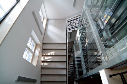 Spoločné priestory budovy sú riešené s citom pre detail a so zmyslom pre veľkorysosť. Objekt je vertikálne komunikačne prepojený dvomi schodiskovými jadrami s panoramatickými výťahmi. „Dvere do bytov simulujú tvar aj kompozíciu pôvodných nemocničných dverí vedúcich do izieb,“ hovorí architekt. Zaujímavé však je, že hoci pôvodná budova bola vystavaná s určenou funkciou nemocnice, tento charakter tu teraz nie je badateľný takmer nikde – azda okrem kúpeľných reliéfov na priečelí zo strany ulice.