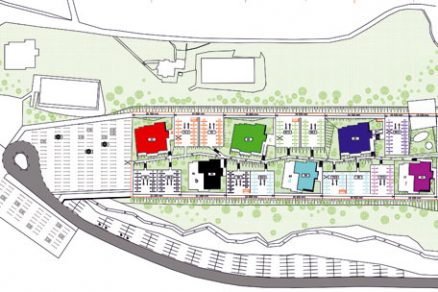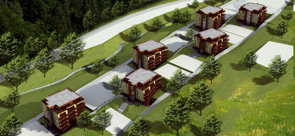 „Do prírodného prostredia sme zakomponovali šesť objektov, pričom stavby využívajú pôvodný reliéf svahu s južnou expozíciou. Pri návrhu budov sa kládol dôraz na dostatok svetla a súkromia obyvateľov – objekty terasovito kopírujú svah vo dvoch kompozičných líniách,“ dodáva.
