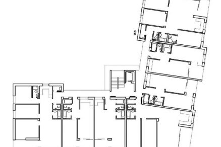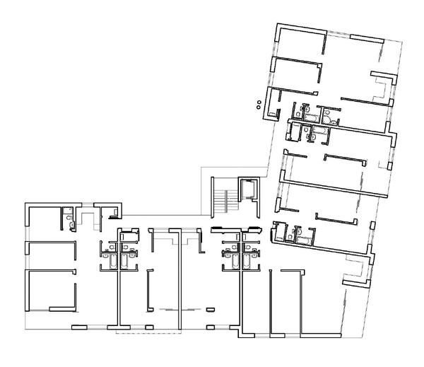 Pôdorys bytového domu tvorí dvojkrídlová dispozícia. Komunikačné priestory sú riešené ako pavlač prepojená vertikálnym jadrom a orientovaná do dvora smerom na severovýchod.