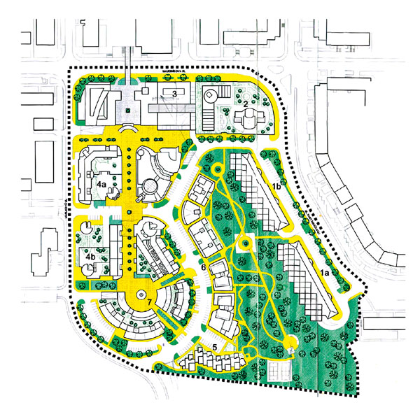 Jednou z lokalít s výraznou novou zástavbou v Bratislave je miesto na svahu nad Dunajom, pôvodne určené pre Centrum obytného súboru Dlhé Diely. Pôvodné plány z 80. rokov 20. storočia tu uvažovali o pestrej polyfunkčnej zástavbe ako protiklade k realizovaným panelovým obytným blokom. Mestská časť a magistrát však postupne podľahli tlaku developerov a stavebných firiem a povolili zástavbu solitérnych domov či skupín bez jednotného urbanistického konceptu pre toto jedinečné územie. Prvotný zámer hlavnej kompozičnej zelenej osi pre peších, ktorá by vytvorila nový verejný priestor, sa akosi vyparil a zostalo len torzo – pešia lávka nad hlavnou ulicou (ulica Majerníkova). Príbeh tohto sídliska je však symptomatický aj pre mnohé ďalšie...