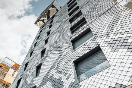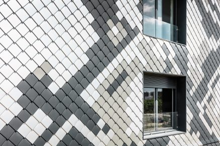 Niečo vidieť a súčasne nevidieť nič. Materialita je v architektúre veľmi dôležitá. Édouard François nechcel ďalšiu pomaľovanú budovu, ale budovu s pravdivým materiálom. Prostriedkom sa stali PREFA fasádne šablóny. Vybrali antracitovú a striebornú farbu a k tomu pribrali ešte dva medzitóny, svetlú sivú a prírodný hliník. Použili priemyselne vyrábaný produkt s dlhou trvanlivosťou, a preto zvolili fasádne šablóny. „Ide o železobetónovú budovu s odvetrávanou fasádou,“ hovorí Patrick Gaide z firmy ACEM de Saint Martin d’Héres, ktorý zodpovedal za realizáciu fasády s hadím dizajnom. „Rozmer „hadej“ fasády je mimoriadny. Spolu bolo položených 1 500 m2, čo odpovedá asi 47 000 šablónam.