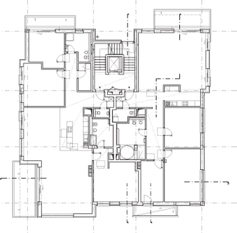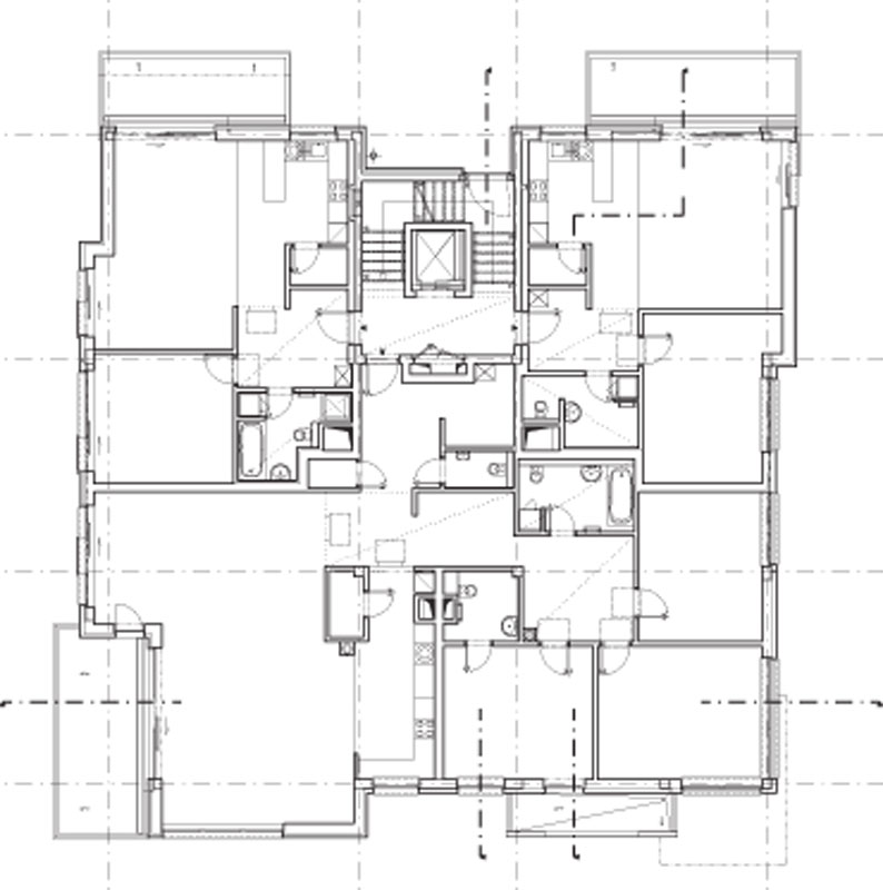 Použili sme komunikačné jadro v podobe trojramenného schodiska s vloženým výťahom v zrkadle. Dosiahli sme tým odhlučnenie, čo zvyšuje komfort bývania, a napokon aj zo schodiskového priestoru ponúkame obyvateľom príjemné výhľady do okolia.“