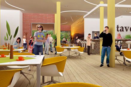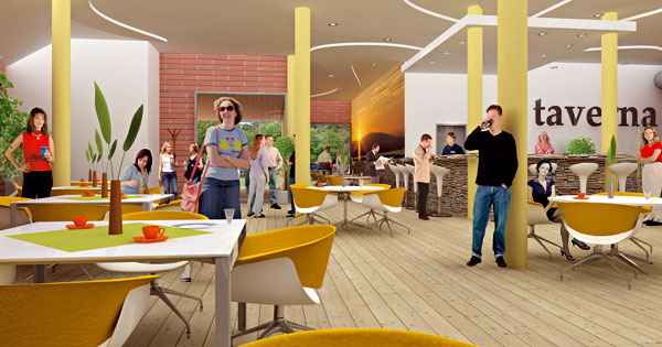 Na prvom. nadzemnom podlaží sú na ploche 1 638,8 m2 predbežne navrhnuté priestory pre reštauráciu, kaviareň, expozitúru banky a obchodnú pasáž s 22 obchodnými jednotkami, ktoré budú dostupné aj z vonkajších arkád. Reštauračné priestory vrátane baru a kaviarne s vonkajším krytým aj otvoreným sedením sú naplánované na ploche takmer 380 m². V ich blízkosti je detské ihrisko.