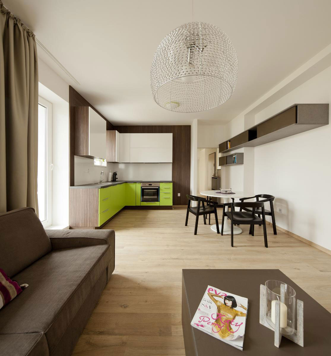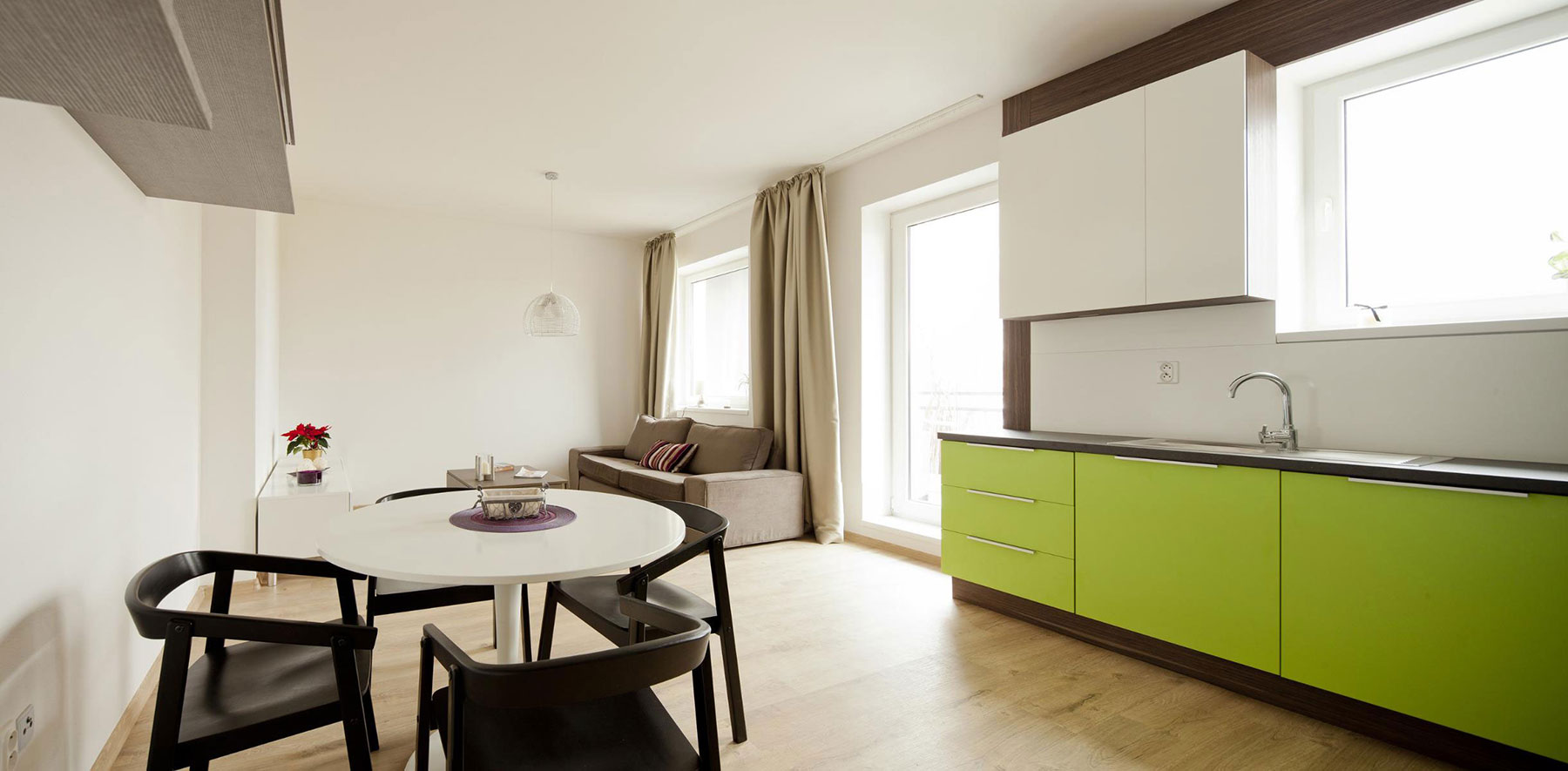 Zo 16 bytov je 15 trojizbových a len jeden dvojizbový. Jediný menší dvojizbový byt vznikol pre pasáž, ktorou sa cez stred bytového domu vchádza na dvor a do parku bytového domu. Priestranné a svetlé byty sú rozumne členené na dennú a nočnú časť, pričom takmer každý byt má šatník a špajzu. Novopostavené balkóny všetkých bytov majú zaujímavých 7 m2 a sú bez výnimky orientované do parku.