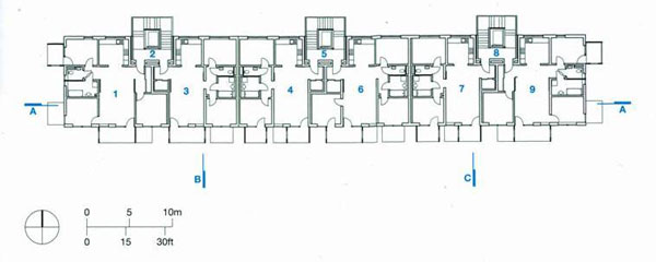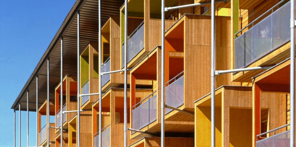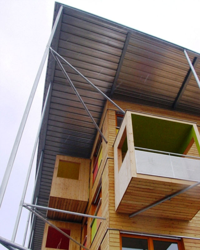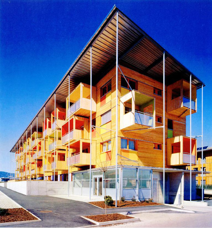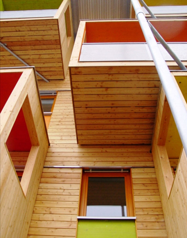 Město Judenburg a spolková krajina Štajersko sponzorovaly mezinárodní soutěž, jejímž vítězem se stal kalifornský architekt Mark Mack se svou urbanistickou studií výstavby 600 bytových jednotek a příslušné infrastruktury. Poskytuje otevřenou a flexibilní infrastrukturu, kombinuje veřejné, poloveřejné a soukromé prostory. Klientovi navrhl i čtyřpodlažní 22bytový nájemní dům s 2 až 4pokojovými byty, maloobchodními prostory v přízemí a podzemní garáží, na který se podíváme blíže. (Rakouské sociální bydlení funguje na principu státem dotovaného pronájmu, který umožňuje nájemníkům odkoupit si své byty po 10 letech.)Střecha domu je z lehkého hliníku, podepřená útlými ocelovými sloupy opřenými o budovu. Balkóny upevněné k fasádě jsou prefabrikované. Zářivé barvy, charakteristické pro Marka Macka, lze vidět na fasádních dřevěných panelech pod okny. Konstrukci podlah a stěn tvoří prefabrikované speciálně laminované panely z pevného stálezeleného dřeva – materiál nazývaný KLH vyprodukoval místní závod. Samotné stěny jsou vrstvené a provětrávané: panely KLH zevnitř, neopracovaný modřínový obklad zvenčí, tepelná izolace a vzduchová mezera mezi nimi. Schodiště jsou betonová s prefabrikovanými prvky.