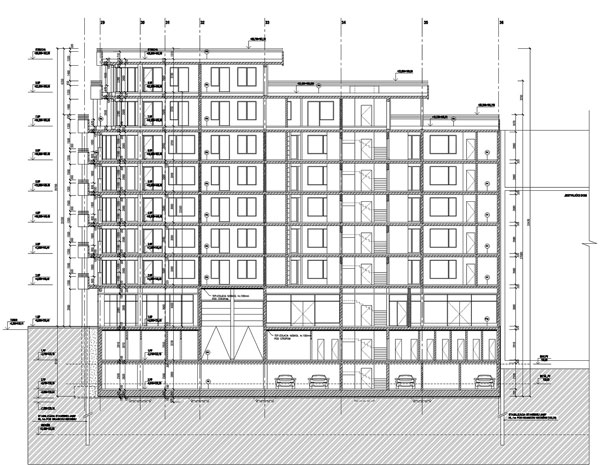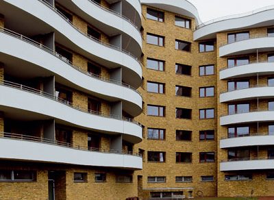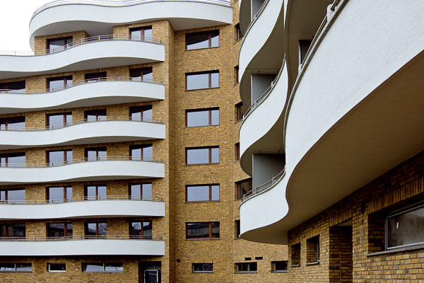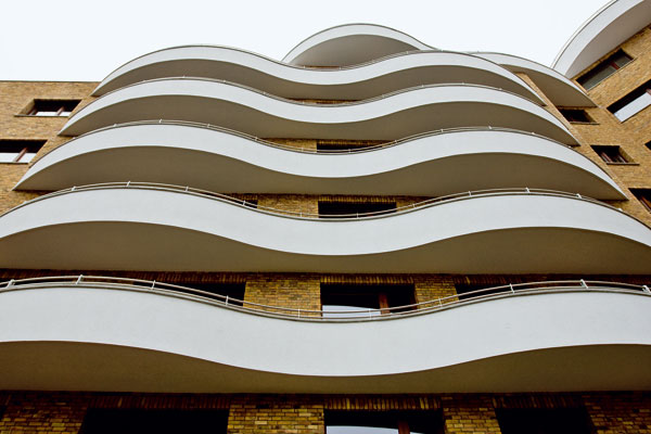 Stavbe vdýchla živosť najmä horizontálna vibrujúca línia terasovitých zábradlí, ktorá na križovaní troch komunikačných trás rozihrala masív celého mestského bloku. Oblúkovité zábradlie pokrýva len jednoduchá svetlosivá omietka s drobnozrnnou štruktúrou, ktorá kontrastuje so základným žltohnedým tehlovým obkladom fasády.