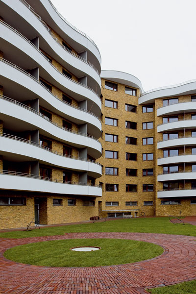 „Niekto by mohol vo výbere tohto materiálu vidieť akýsi návrat k anglickej romantickej architektúre. Z historického hľadiska ide o archetypálnu štruktúru, ktorá pochádza ešte z čias starovekých mezopotámskych stavieb. Tehlová aplikácia je alternatívou chladnej architektúry kovu a skla,“ vysvetľuje architekt. Masívny trojcentimetrový obklad preniká aj do interiéru – vo vstupnej hale ho nájdeme ako obloženie výťahových šácht aj nosných pilierov. Všetky doplnkové konštrukcie z kovu sa prispôsobili základnému farebnému ladeniu, a preto ich na stavbe možno nájsť len v neutrálnom tmavosivom odtieni. Abstrakcia a určitá hravosť sa nakoniec dotkla aj samotného obkladu, ktorý na mieste schodiskových veží vystupuje z fasády vo forme štvorcových plastických vlysov s horizontálnymi tehlovými prúžkami.