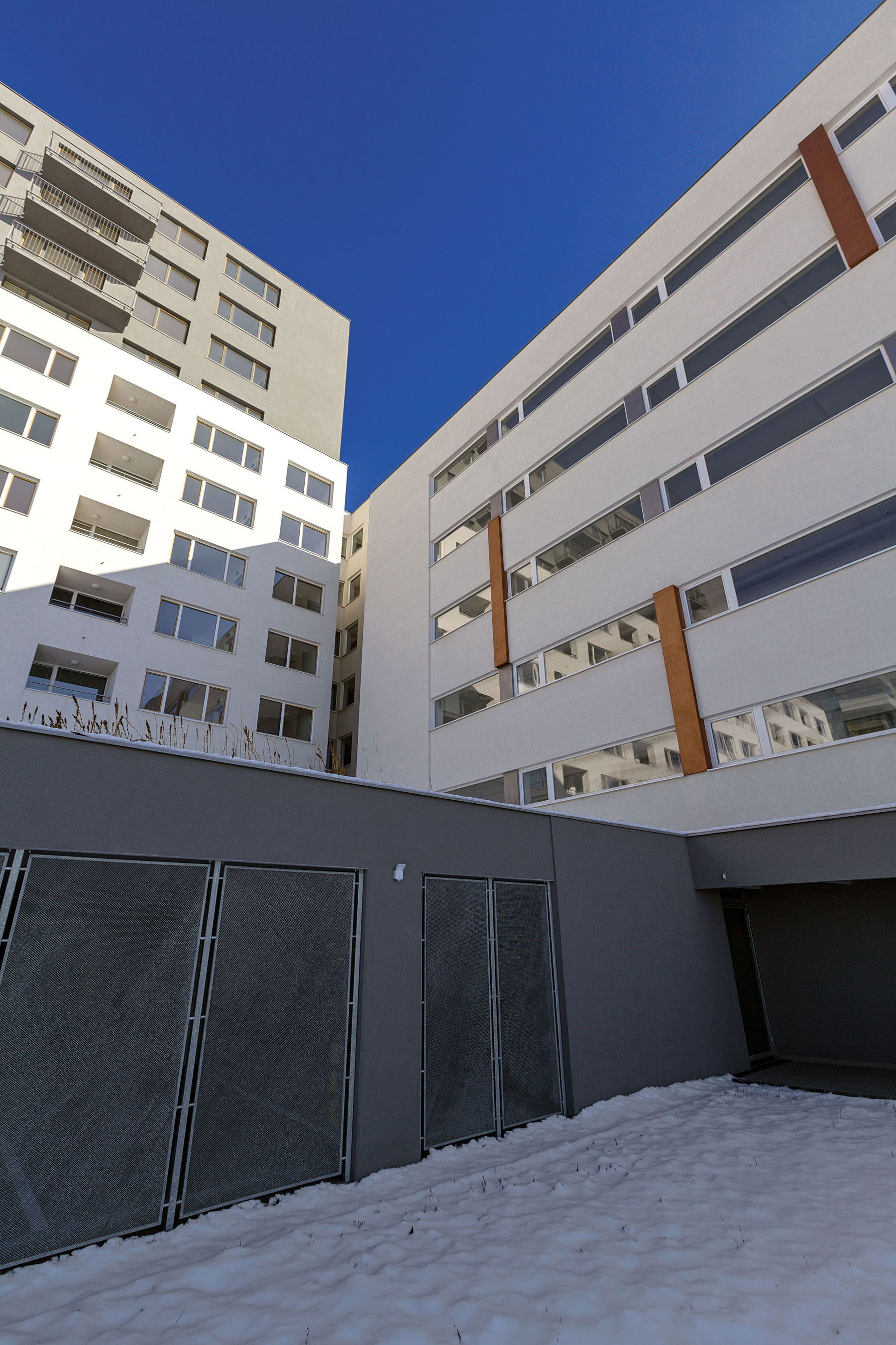 Pohyb v obytnej časti komplexu sa môže zdať pri prvej kompletnej obhliadke zložitý, faktom však je, že aj z podzemnej garáže aj z hlavných vstupov sa ľahko dostanete do vertikálnych komunikačných jadier. Vo vyššom objekte 01 sú dokonca dve jadrá – na každom konci spoločnej chodby jedno. Nižší objekt 02 má dispozíciu pavlačového domu, spoločné chodbové priestory sú príjemne priestranné a veľmi dobre osvetlené. Byty sa klientom predávajú s dokončenými podlahami, s interiérovými dverami a zariadenými kúpeľňami, čiže po montáži kuchynskej linky sa dá rovno nasťahovať. Ďalším bonusom, ktorý zároveň vysvetľuje, prečo je väčšina bytov už predaných, je rozloha a dispozície bytov. Myslelo sa na priestranné šatníky v predsieni, na potravinové skrine a priestor na chladničku v kuchyni, či umiestnenie práčky v kúpeľni.