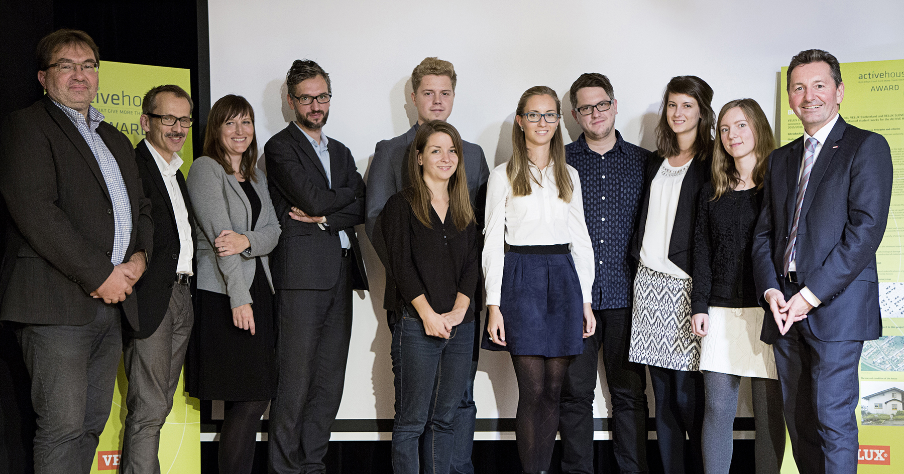 Spoločná fotografia umiestnených študentov spolu s odbornou porotou a zástupcami spoločnosti VELUX i obce. Zľava: Wolfgang Ullman, vedúci stavebného úradu vo Wolkersdorfe, architekt Martin Stuber, člen poroty, Ing. arch. Klára Bukolská, členka poroty, Ing. arch. Adam Gebrian, člen poroty, Lukáš Kvaššay, 1.miesto, Jana Zavřelová, 2.miesto, Júlia Giláňová, 3.miesto, Kryštof Foltýn, odmena, Dominika Gáborová, odmena, Anna Šlapáková, odmena