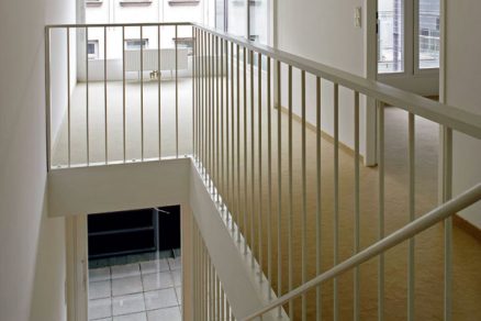 Na dlhej strane dispozície uvádzajú dvoje dverí do centrálnej miestnosti, ktorá sa môže deliť ľahkými priečkami. Tento model umožňuje, aby sa z jednej veľkej obývačky vytvorili dve či tri malé izby. Ide pritom o veľmi jednoduchý, ale efektný zásah, ktorý vniesol do usporiadania nový moment. Vnútorné schodiská sa väčšinou skladajú z oceľovej konštrukcie upevnenej do dosiek stropu, sú to tzv. samonosné schodiská.